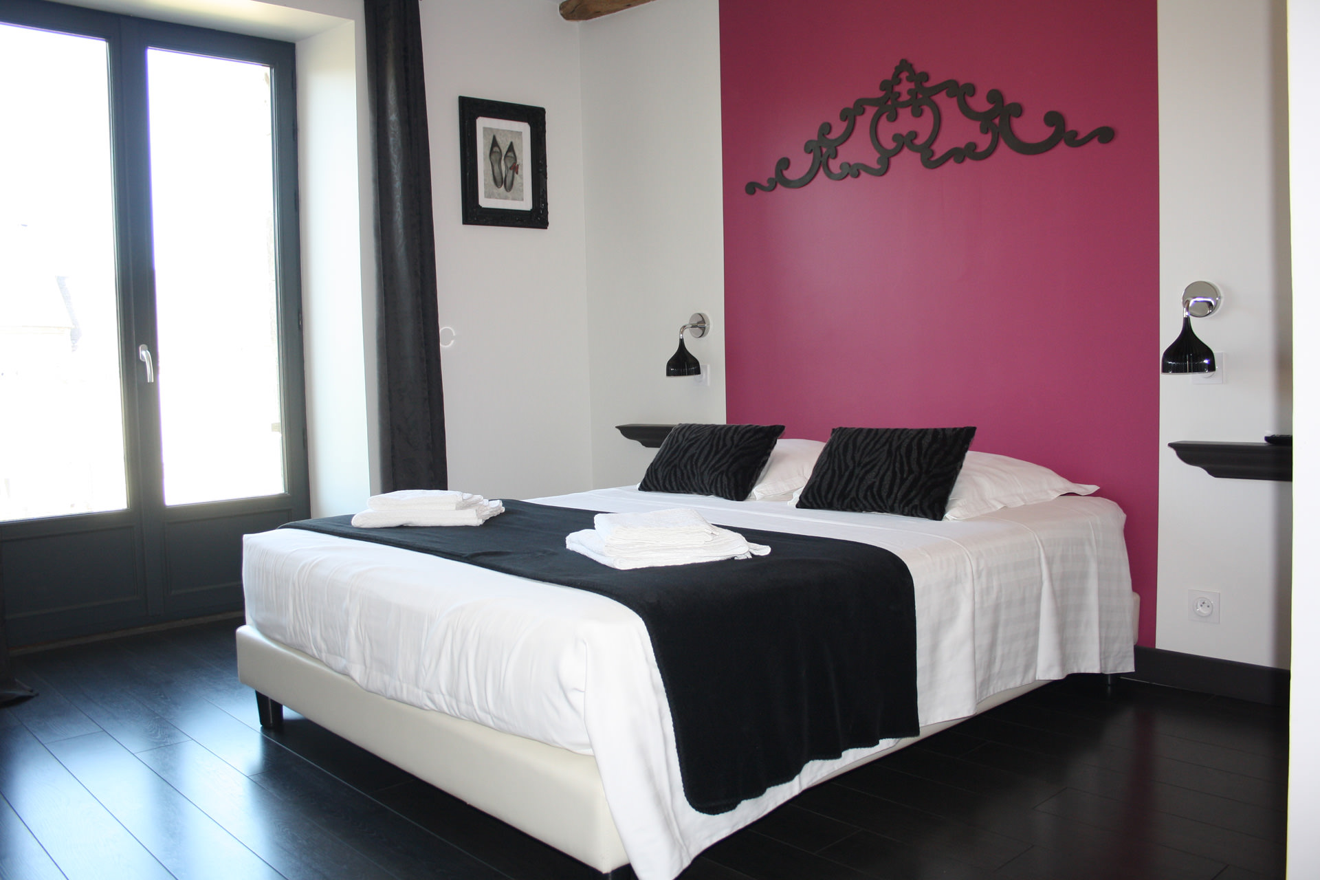 Cette grande chambre (20 m2 située au 1er étage) est décorée dans des tons blancs cassés et noirs, rehaussés de touches de rose, dans un esprit baroque chic.